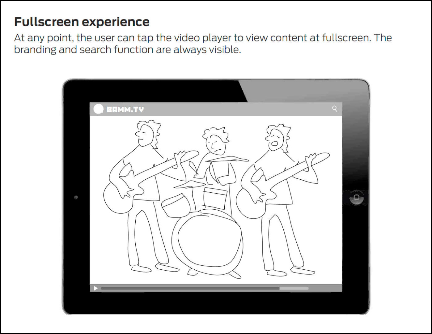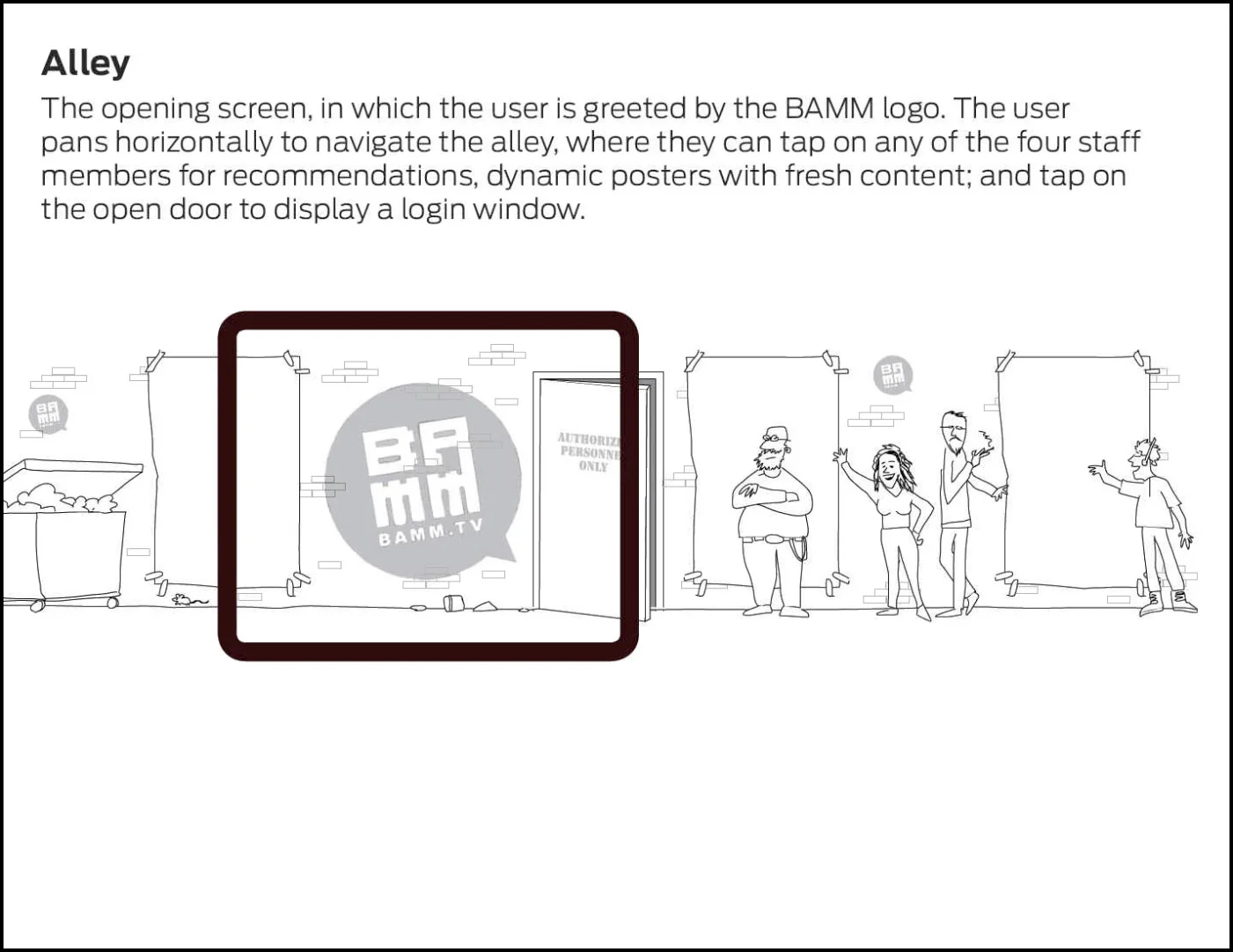 Dr. Garcia invited us to be part of the team based on our experience producing other storytelling apps. After viewing other music players and finding them to be vanilla and impersonal, we sketched out an experience-based app that placed the user into a gritty environment, interacting with BAMM.tv staff in an alley patterned after their San Francisco headquarters before entering a concert space where music was being performed on a virtual stage. Some of our initial sketches that were presented to Mario and the Hansen brothers: